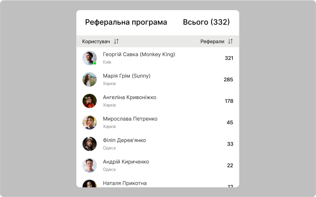Це список прихильників, які запросили інших приєднатися до вашої організації за допомогою реферального посилання. Число біля кожного імені показує, скільки членів спільноти приєдналися за посиланням цієї людини.