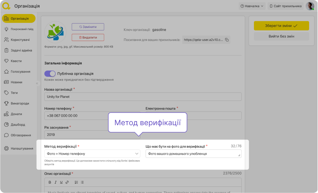 Під час реєстрації вам необхідно вибрати спосіб, який ваша організація використовуватиме для верифікації ваших волонтерів (у вас буде змога змінити обраний метод верифікації у налаштуваннях організації.). Ви можете робити це за електронною поштою, номером телефону, номером телефону та фото, або тільки за фото. Ви самі вирішуєте, що саме має бути зображено на фото — наприклад, ІД-картка . Після того, як ви вручну перевірите прихильника, його фотографії видаляються із сервера.